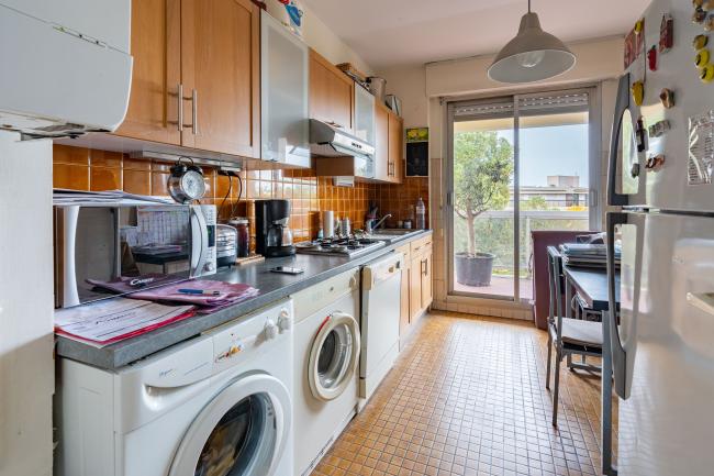 L’appartement est un grand deux pièces situé au quatrième étage d’une superficie de 72,53 m² Carrez. Il se compose d’une grande pièce de vie de 36 m², d’une cuisine séparée, d’un cellier, d’une chambre, d’une salle de bain, d’un wc séparé et d’un balcon de 23 m² exposé plein sud sur toute la longueur de l’appartement, auquel on accède depuis la chambre, la cuisine et le double séjour.