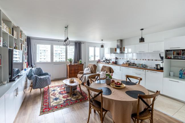 L’appartement, situé au onzième étage par ascenseur, a une surface de 70 m2 Carrez.
