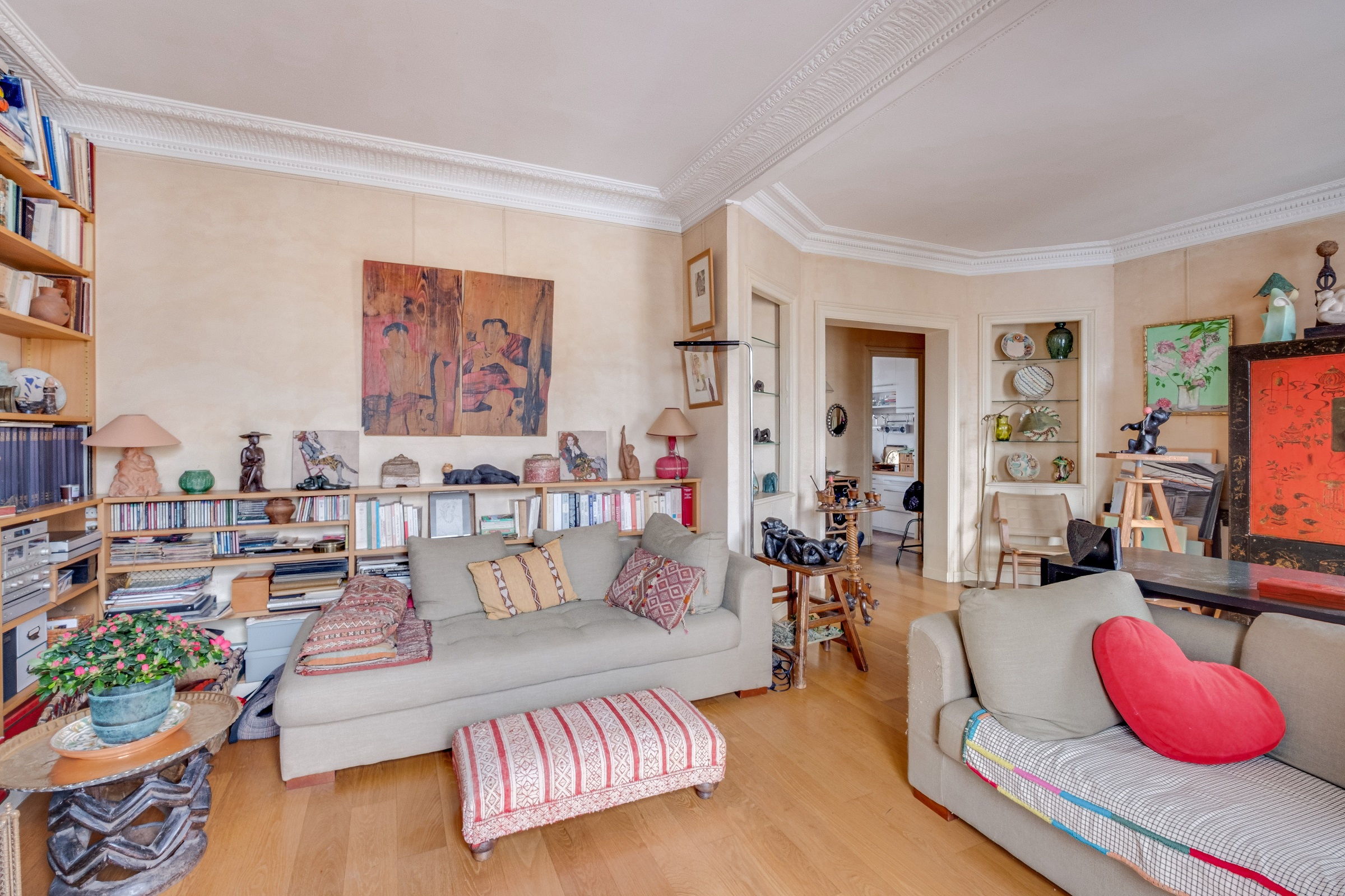 Le salon est exposé Sud-Ouest et donne sur les jardins de la copropriété. La chambre est orientée Nord-Est et donne sur le parc Beloeil. La hauteur sous plafond dans les pièces est de 2m76. Le chauffage est individuel au gaz.
