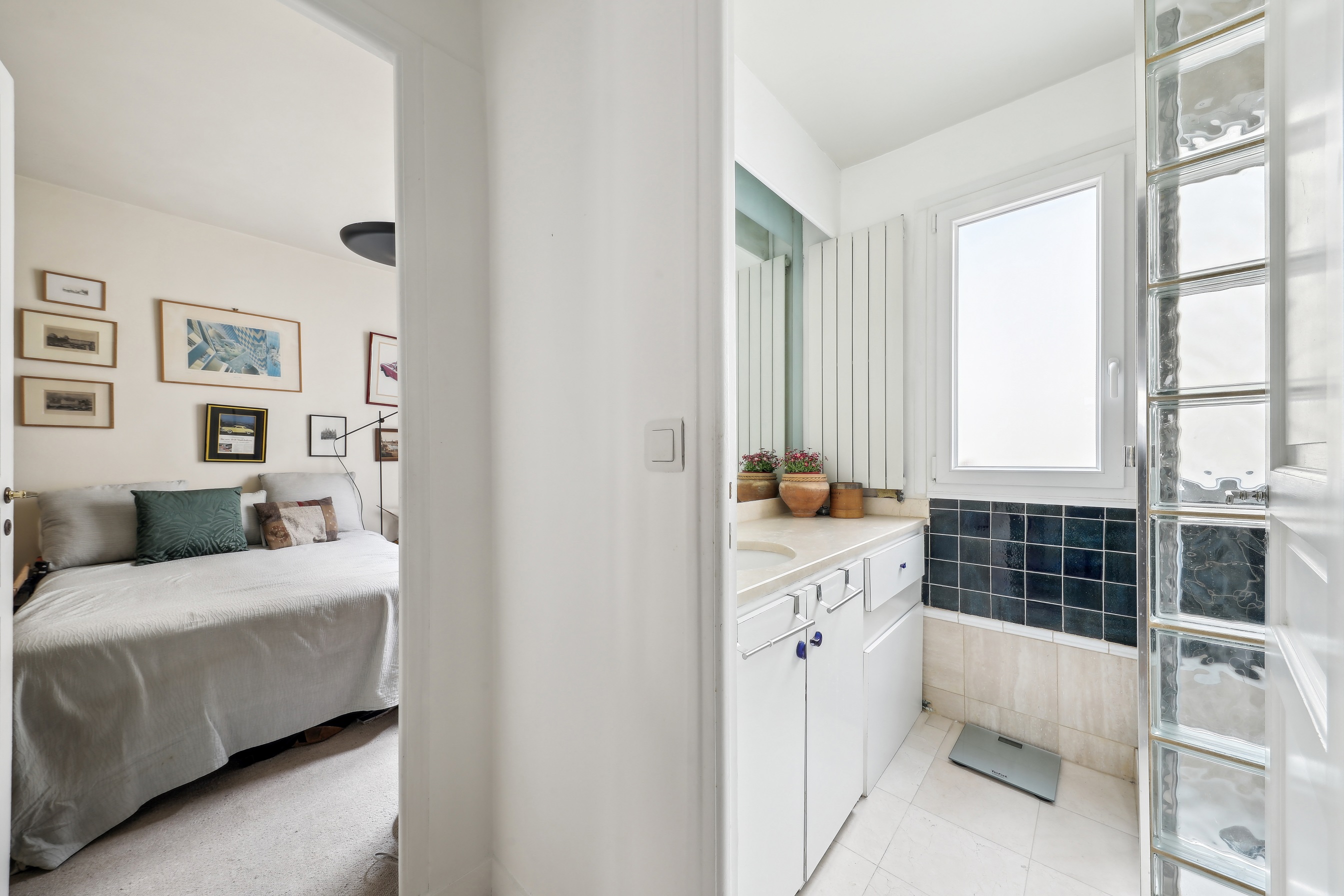 Il offre une entrée, un grand salon avec cuisine ouverte, deux chambres de part et d’autre d’une salle de douche, ainsi qu’un wc. Les 2 chambres font environ 12 m² et 14 m² et donnent sur la courette.