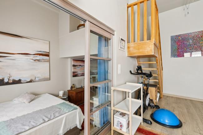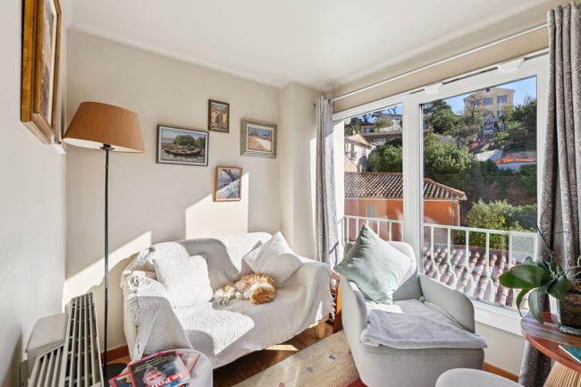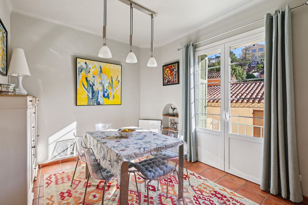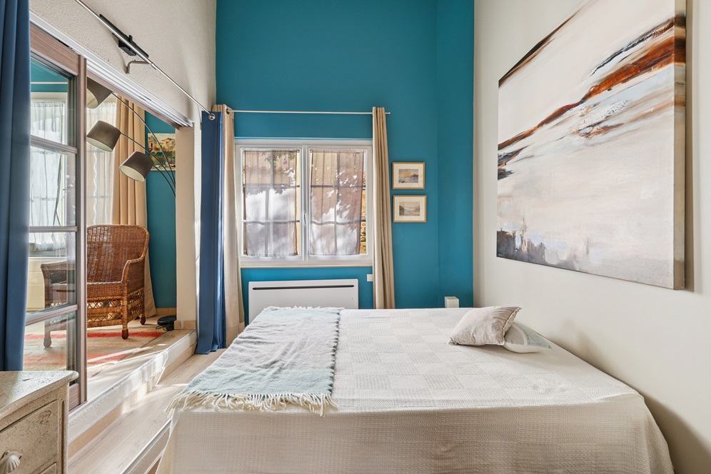 À l’étage, un salon baigné de lumière s’ouvre sur une vue dégagée sur le village. Il est complété d’une spacieuse chambre et d’une salle d’eau avec WC, formant un ensemble harmonieux et confortable.