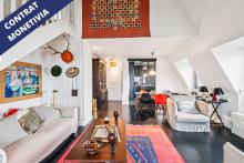L’entrée de cet appartement en duplex, d’une surface carrez de 66,8 m² + 4 m² au sol (soit une surface pondérée de 69 m²) , se fait au 4ème étage. Il comprend au premier niveau : une entrée, un séjour de 31 m² avec une hauteur sous plafond de plus de 5 mètres, une cuisine, une salle d’eau, un WC et une terrasse.
