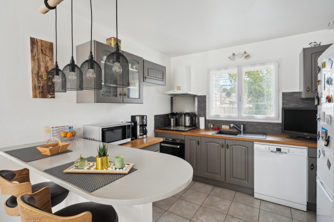 D'une superficie habitable de 82 m², la maison comprend une cuisine s'ouvrant sur le séjour, créant un espace de vie convivial, trois chambres dont une en mezzanine résultant d'une transformation du garage précédent et une salle de douche.