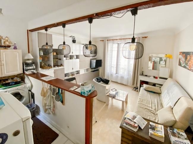 Cet appartement de deux pièce, situé au premier étage, offre une surface de 33 m² Carrez avec une hauteur sous plafond de 2,82 m. L’entrée ouvre à droite sur un salon lumineux doté d’une cuisine ouverte ; et à gauche sur une chambre spacieuse qui dispose d’un placard intégré et sur une salle d’eau comprenant une douche, une vasque et un WC.