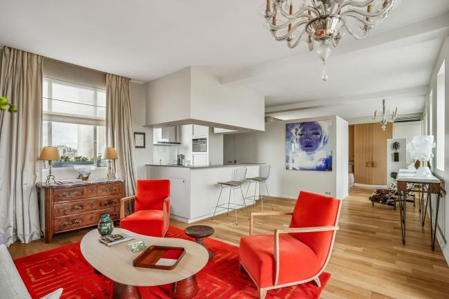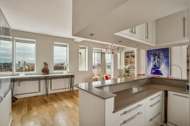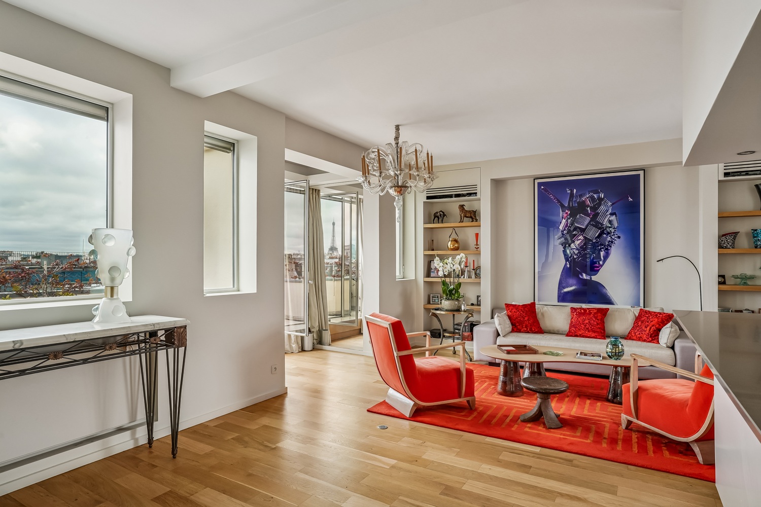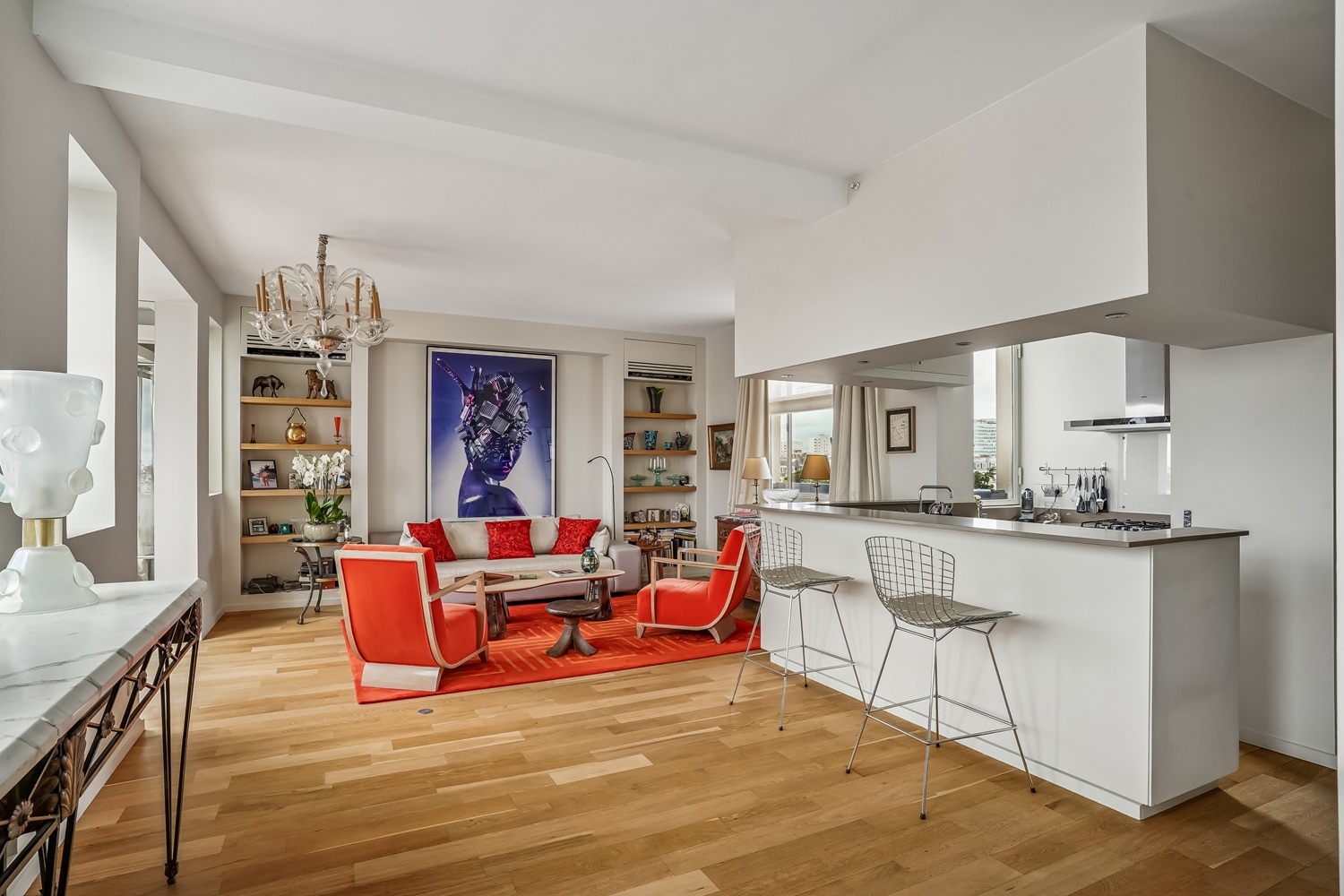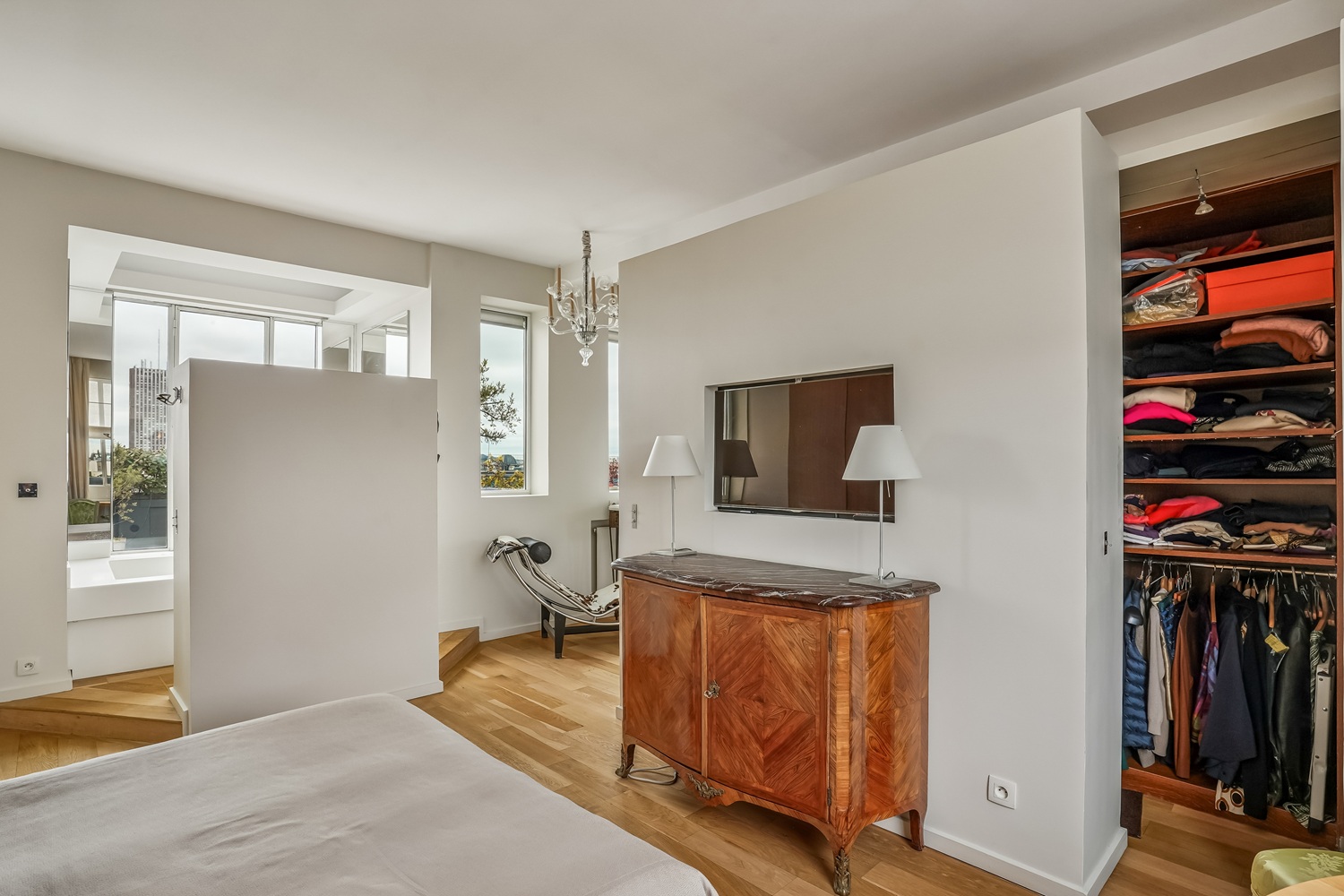 L’accès se fait par le cinquième étage. L’entrée, incluant un coin bureau, mène à un grand séjour très lumineux avec cuisine ouverte, ainsi qu’à une chambre avec dressing et salle de bains, le tout s’ouvrant sur une terrasse plein ciel de 22m² exposée sud-ouest.