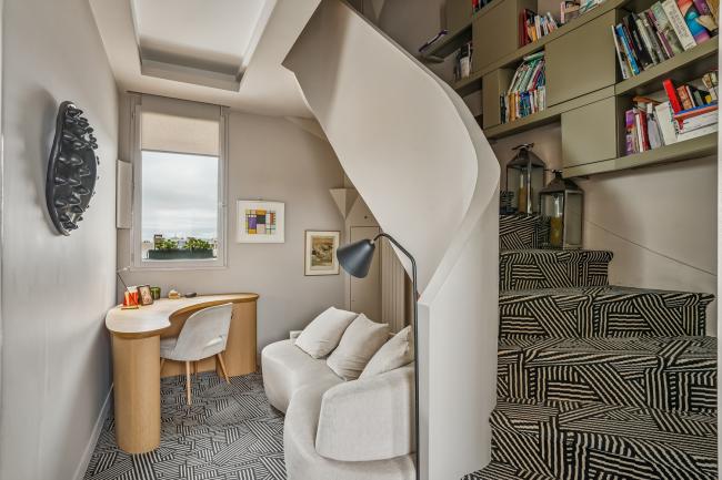 Un premier escalier mène vers le quatrième étage qui offre de nombreux espaces de rangement, tandis qu’un second escalier mène directement au toit-terrasse.